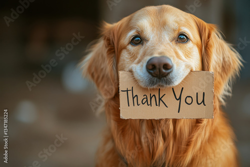 Dog wearing a "thank you" sign on face, looking at the camera with a joyful expression.