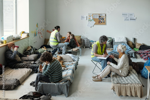 Male and female volunteers in fluorescent vests getting personal information about settlers of refugee camp and filling in forms