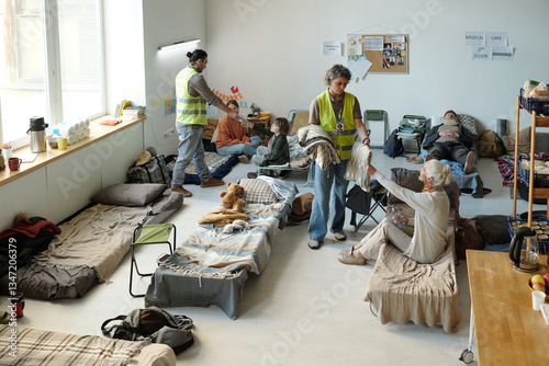 Volunteers of crisis center in reflective jackets passing water and warm blankets to people in trouble sitting on couchettes