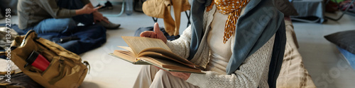 Header of senior female refugee reading book while sitting on couchette in crisis camp for homeless people against woman