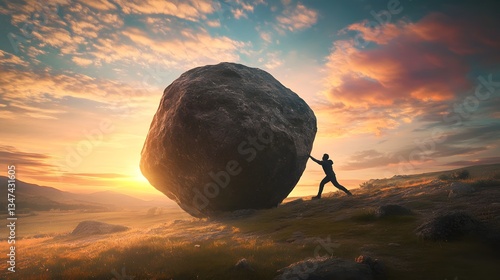 A person pushing a huge boulder uphill, symbolizing challenge and determination against a picturesque sunset background