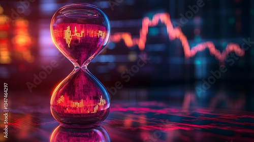an hourglass filled with red sand against the backdrop of a financial chart, symbolizing the passage of time and market fluctuations.
