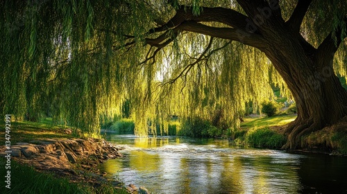 Tranquil riverside scene featuring a majestic willow tree cascading over water