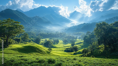 Serene blue skies, hazy mountains, and lush green rolling hills create a tranquil, naturally beautiful landscape.