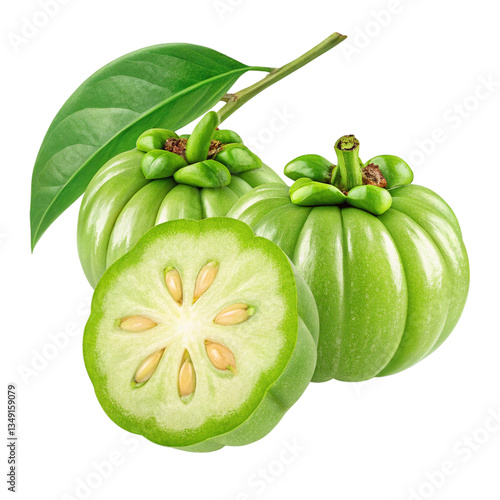 fresh garcinia cambogia fruits with green leaf and cross section showing seeds isolated on white