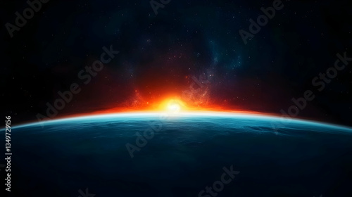Cosmic Sunrise Over Distant Planet Against Dark Starry Sky with Bright Light and Blue Atmosphere