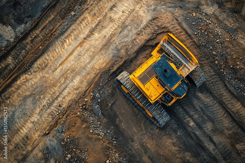 Colossal yellow bulldozer plows vigorously through a construction site, showcasing industrial power and progress