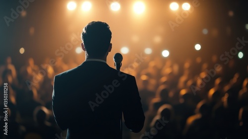 Speaker addressing large audience on stage, spotlight background, event presentation