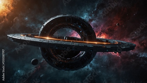 A futuristic space station orbiting a giant black hole, with massive energy rings absorbing cosmic radiation.