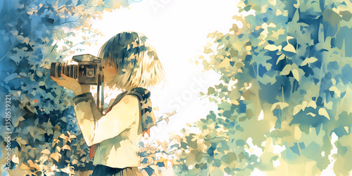 フィルム写真の魅力にハマった女性。イラスト。水彩。背景素材。