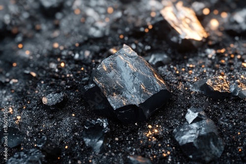 Glowing dark rocks with metallic sheen, scattered on a dark surface, illuminated by sparks.
