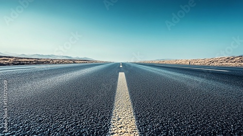 Empty asphalt road vanishing into a clear blue sky and distant mountains under bright sunlight.