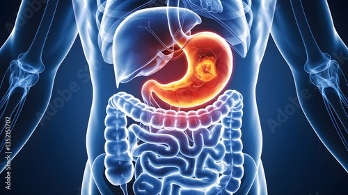An illustrative editorial content piece depicting the human digestive system. A highlighted stomach shows detail around ulcer or stomach cancer conditions.