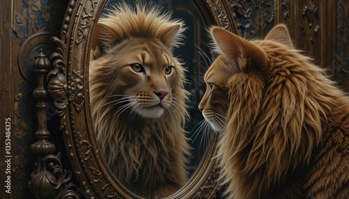 A cat gazes into an antique mirror, its image of a lion signifying metamorphosis, self-assurance, and concealed grandeur.