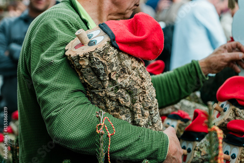 Man holding tio de nadal, traditional catalan christmas log, at christmas market