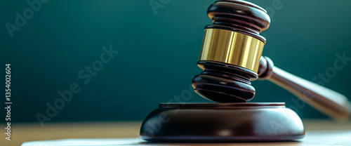 Close-up of a judge's gavel on a dark wood sound block, against a teal background. Showcase of justice, law, and legal concepts. Free space for text