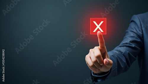 Hand taps red cross icon to cancel item clarifies approval rejection process ensures formal brand governance fosters systematic decision minimal confusion concept as Person triggers cancellation secur