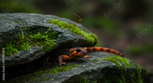 Salamander Resting on Mossy Rock in Forest Habitat Close-up