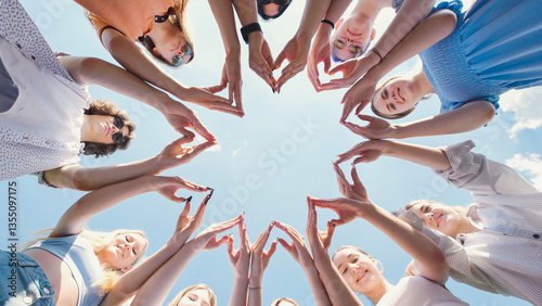 School friends unite to form star shape with their hands against blue sky, representing teamwork and friendship