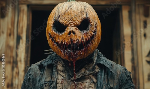 A terrifying figure with a carved pumpkin head, dripping blood, stands before a rustic wooden building