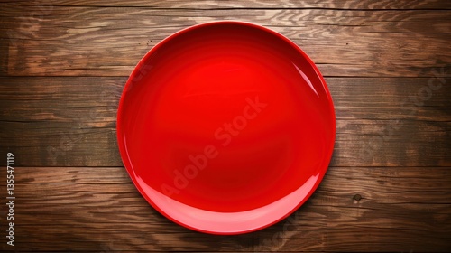 A vibrant red plate rests on a rustic wooden table, highlighting its emptiness and the charm of natural materials.