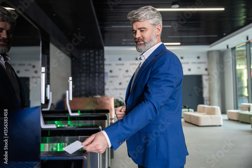 Gray-haired mature business man in dark-blue suit entering office with an access card