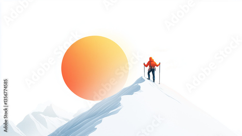 Mountaineer with orange jacket and backpack reaching the top of a snowy mountain at sunrise, enjoying the stunning view and the sense of accomplishment