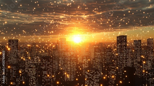 Golden hues of sunset fall upon the sprawling skyline of a futuristic city