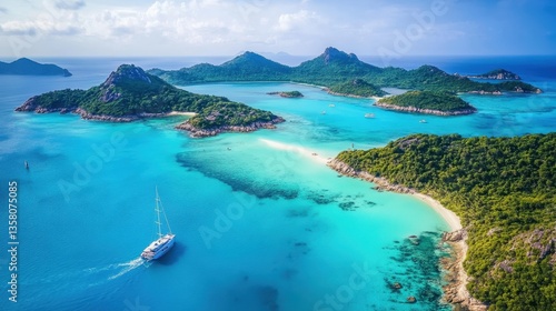 Stunning coastal view of island landscape with boats sailing in clear turquoise water on a sunny day