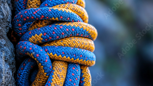 Different colored ropes tied in tight knots represent teamwork, struggle, and modern challenges, symbolizing unity, tension, collaboration, and overcoming obstacles together