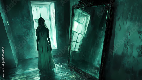A mirror in the corner reflects a ghostly woman with hollow eyes and a stained dress her presence a reminder of tragedy and horror. Hollow Mirror. Illustration