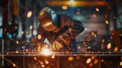 A Welder at Work, A welder in protective gear, creating bright sparks as they work on metal structures in a workshop or construction site.