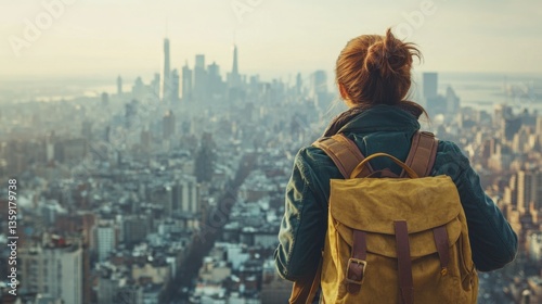 A woman hikes up a city rooftop with a backpack, overlooking the skyline of New York.