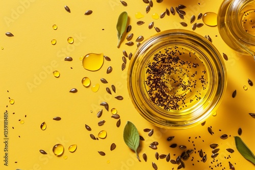Organic flaxseed oil in a glass jar surrounded by whole flaxseeds on a vibrant orange background