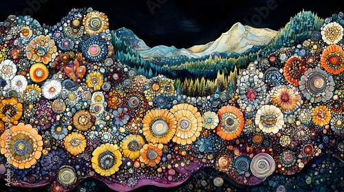A vibrant colorful floral and mountainous landscape is created with an array of textured details and a dark background