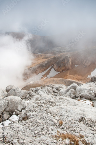 Picturesque view from the peak of the Mount Oshten covered with thick fog in autumn, Adygea, Russia
