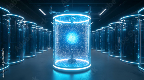 Futuristic data center visualization featuring glowing cylindrical pods and a central drone. Could represent advanced data storage or a digital network infrastructure. Suggests innovative technology s
