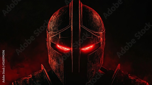 ancient spartan helmet with red glowing furutistic cyber eyes in the dark looking straight