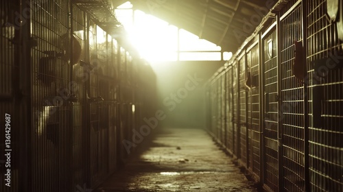 Sunlit animal shelter kennel rows