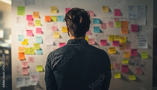 Man Reviewing Colorful Sticky Notes on a Wall