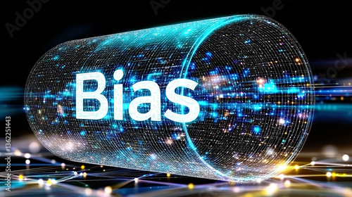 A glowing digital capsule with the word "Bias" outside, surrounded by vibrant lights and data patterns, symbolizing bias in technology or artificial intelligence.