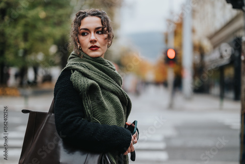A young woman with curly hair, wearing a green scarf, stands outdoors on a city street. She gazes to the side with a contemplative expression under overcast conditions, surrounded by urban