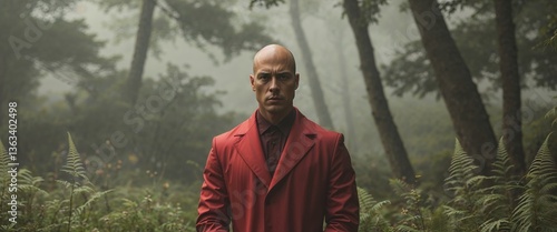 Contemplative Bald Man in Red Coat Amidst Lush Greenery.