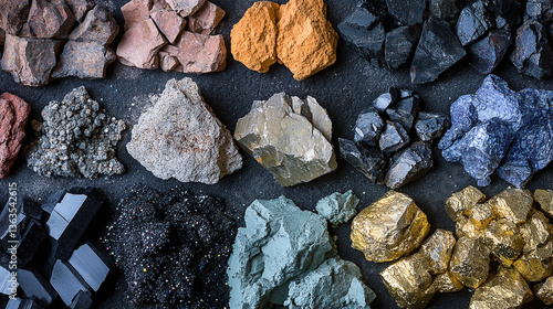 Detailed texture of variously colored stones, including metallic gold pieces. Perfect for geology or scenic texture design backgrounds.