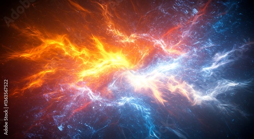 赤と青の炎が激しくぶつかり合う抽象画 鮮やかな対照色と動的な構図