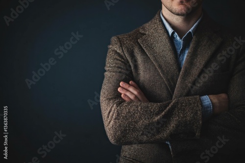 Stylish man in a brown tweed jacket with crossed arms, exuding confidence in a dark background, ideal for fashion and business concepts