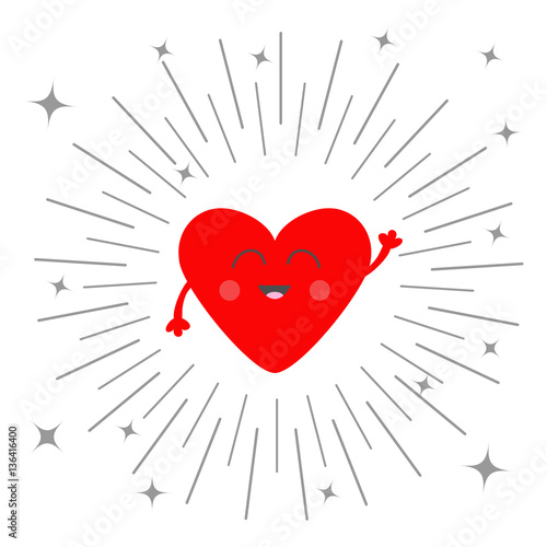 Red heart face head with hands. Cute cartoon kawaii smiling character. Round line shining star circle. Valentines day sign symbol. Flat design style. Greeting card. Isolated. White background.