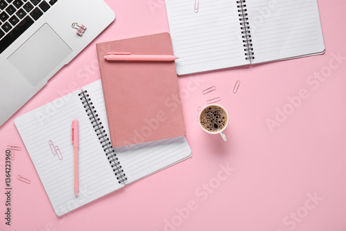 Notebooks with paper clips, cup of coffee and laptop on pink background
