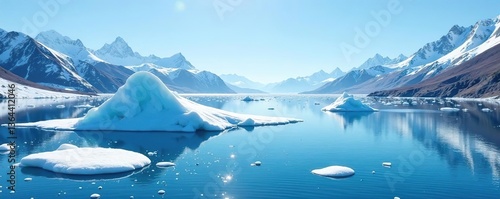 Frozen bay with large ice floe surrounded by mountains and clear blue skies, cold, bay