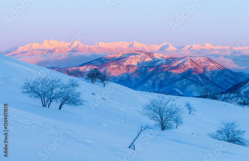 春の霧ケ峰高原車山湿原遊歩道から北アルプスビーナスベルトとモルゲンロート